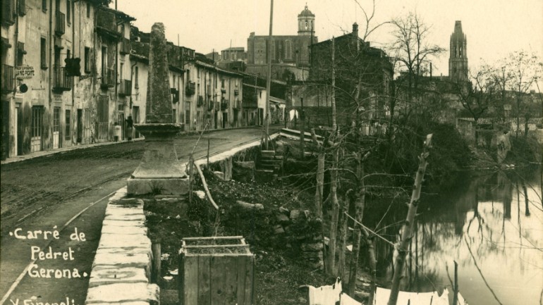 Dinamització: Fundació Josep Pla. Producció: Escola Municipal d'Humanitats de Girona. Lloc de trobada: Jardí de la Infància. Descomptes: alumnat de l'Aula d'Escriptura de l'Ajuntament de Girona, socis del GEiEG i altres. Reserves a: 972 30 55 77 i a info@fundaciojoseppla.cat. Imatge: Vista parcial del carrer de Pedret. Autor: Valentí Frangoli. 1902 - 1940. Fons EMB. INSPAI, Centre de la Imatge. Diputació de Girona