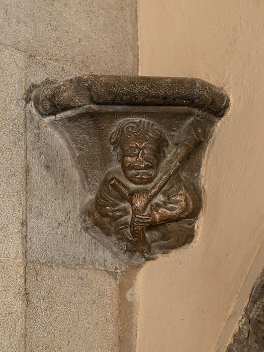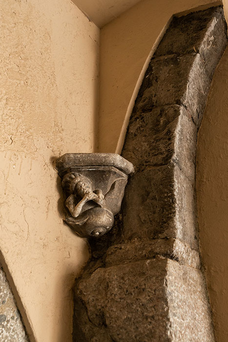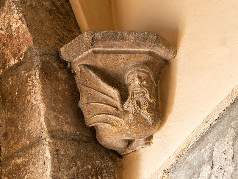Sota les voltes de la Rambla [...], hi ha tres mènsules de pedra esculpides que segurament havien aguantat abans l'inici dels nervis d'una volta. La quarta ha desaparegut. Una d'elles és ben normal: figura un home que toca el sac de gemecs, la gaita gallega. Però les altres dues són més inquietants: una representa un home cargol, és a dir, un cap d'home amb un voluminós barret, que surt de la recargolada closca d'un cargol. L'altra, un estrany ancià amb llarga barba, amb dues vampiresques ales de ratapinyada. Segurament no tractaven de representar res concret sinó que, seguint la moda de l'art gòtic, copiaven les estranyes figures que se solien pintar als marges dels manuscrits medievals, els fantasiosos marginalia on l'il·luminador en lloc de dibuixar les pietoses imatges religioses de les figures centrals, deixava anar la seva fantasia inventant impossibles combinacions anatòmiques.