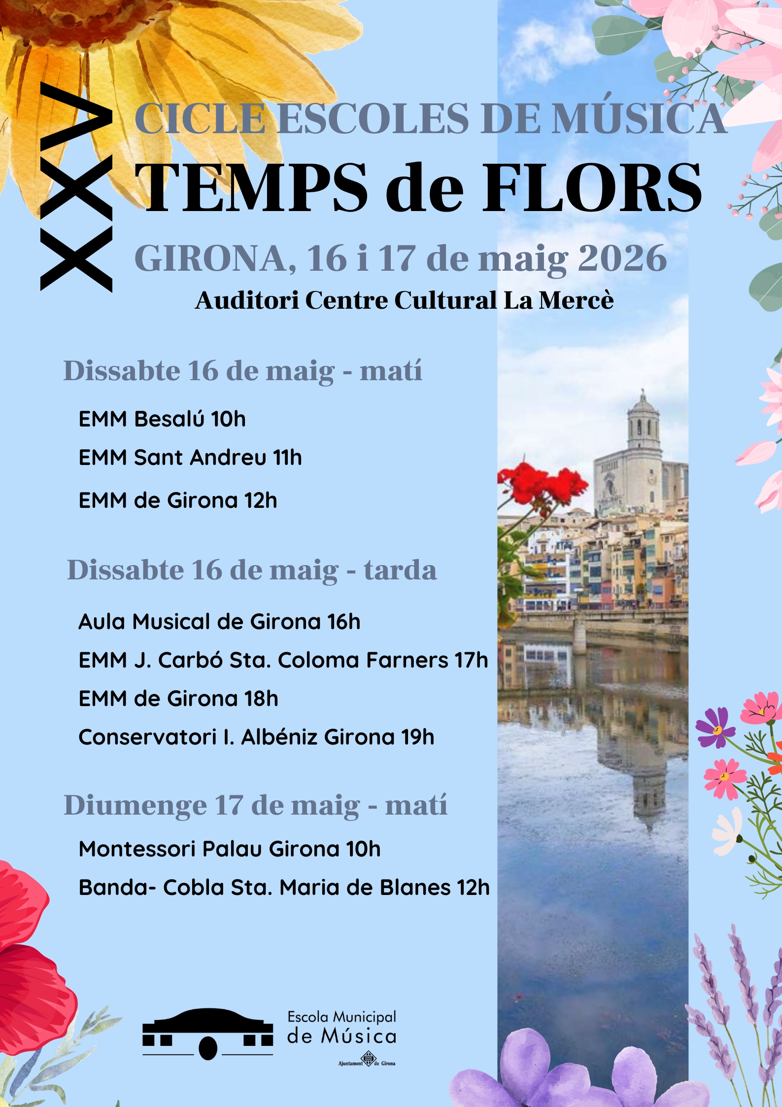 Els dies 16 i 17 de maig de 2026, l'Auditori del Centre Cultural La Mercè es convertirà en escenari d'un ampli ventall d'actuacions protagonitzades per alumnat de diverses escoles de música. Aquesta proposta ofereix als músics estudiants una oportunitat única per mostrar el seu treball en un entorn cultural, coincidint amb l'ambient vibrant i primaveral del Temps de Flors.