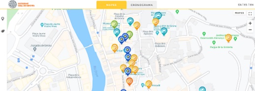 A través de la secció Mapa interactiu del Call de Girona podreu trobar informació pràctica sobre els principals punts d'interès relacionats amb la cultura jueva a la ciutat de Girona. Actualment hi ha 29 punts catalogats i geolocalitzats en un mapa de la ciutat, classificats per categories (tipus d'element, característiques, estat), tipologia o origen (època o cultura a la qual pertanyen). També podeu consultar el Cronograma, una línia temporal que situa visualment cada esdeveniment rellevant de la història jueva de Girona segons el moment històric en el qual van tenir lloc. © 2025 Patronat Call de Girona | Contacte | Accessibilitat web |