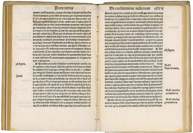 The radicalization of mentalities, political and social changes and situations of crisis can turn peaceful coexistence into a situation marked by extreme violence. From the 14th century onwards the Jewish communities were often attacked, marginalized or accused of various crimes and acts of sacrilege. At the end of the fifteenth century, the Jew's conversion edict poured many families into exile. Outstanding itemsDocument making it compulsory to wear a signal1394, Majorca. Reproduction (original in the Archives of the Kigdom of Majorca). Liber de Confutatione Hebraicae SectaeRome, 1500. Arising from the numerous disputes and religious controversies that developed between Jews and Christians all over medieval Europe, various texts were published which attempted to refute the tenets of Judaism by referring back to its own sources. This volume, for example, which was published in Rome in 1500, contains a refutation of the thought of some of the leading medieval Jewish figures such as Maimonides (Moses Cordovensis) and Nahmanides (Moses Gerundensis). Edict of Expulsion, 1492Manual of Agreements, April 20, 1492. Reproduction (original in the Municipal Archives of Girona). |