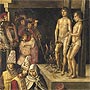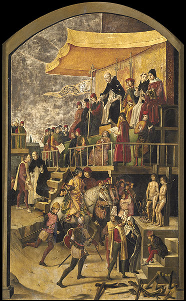 In 1478, the Catholic Monarchs created the Tribunal of the Holy Office of the Inquisition, to persecute heresy and impose the Christian faith. In the eyes of the Inquisition, the entire population of converts was suspected of practising Judaism in secret. For this reason, they were relentlessly controlled and persecuted. This section revolves around the horrors and hardships of those people who were persecuted and tortured. Outstanding items"Auto-da-Fé"Pedro Berruguete, 16th century (image of the painting found at the Prado Museum, Madrid). The brutal repression engendered by the Inquisition against converted Jews led to the holding of the now infamous "Autos-da-Fé", public trials and executions of those accused of practising Judaism, and which were held with great pomp and ceremony to teach a lesson to all individuals who dissented from what was considered to be the "one true faith". Shield of the InquisitionStone. 18th century, Girona (cession of the Archeology Museum of Catalonia. Girona). |