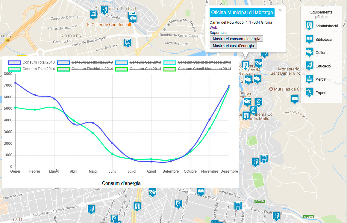 This project of the Girona Smart City Chair has the objective to enhance the energy consumption in public buildings (such as: schools, library, civic centers, offices, etc.). The project reuses open data from the city of Girona about public buildings and the resources related to them in order to visualize energy behavior in an intuitive way that facilitates energy awareness and decision-making. The final application allows the comparative view of energy consumption in various public buildings and also the comparison of the average consumption of facilities of the same category. The objective is to make this information accessible to both: facility managers and citizens, in order to facilitate decision-making and foster awareness on the efficient energy consumption in public spaces and facilities.