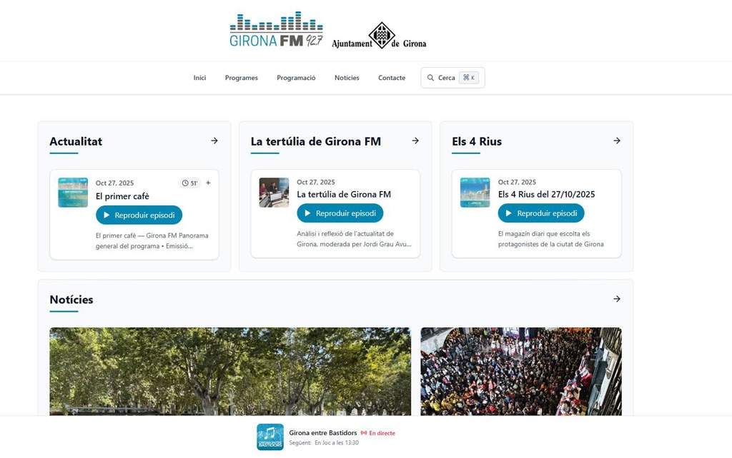 L’emissora de ràdio municipal Girona FM ha posat en marxa una nova pàgina web amb l’objectiu de reforçar la seva oferta informativa i potenciar l’escolta digital de la seva programació. El nou portal aposta per una navegació més intuïtiva i directa, amb un accés fàcil als continguts en àudio i una millor experiència d’usuari/ària. A més, incorpora una secció de notícies d’actualitat local i de resum de les principals entrevistes emeses en la programació de l’emissora. D’aquesta manera es vol potenciar la distribució digital dels continguts de l’emissora de ràdio municipal a través de la web.