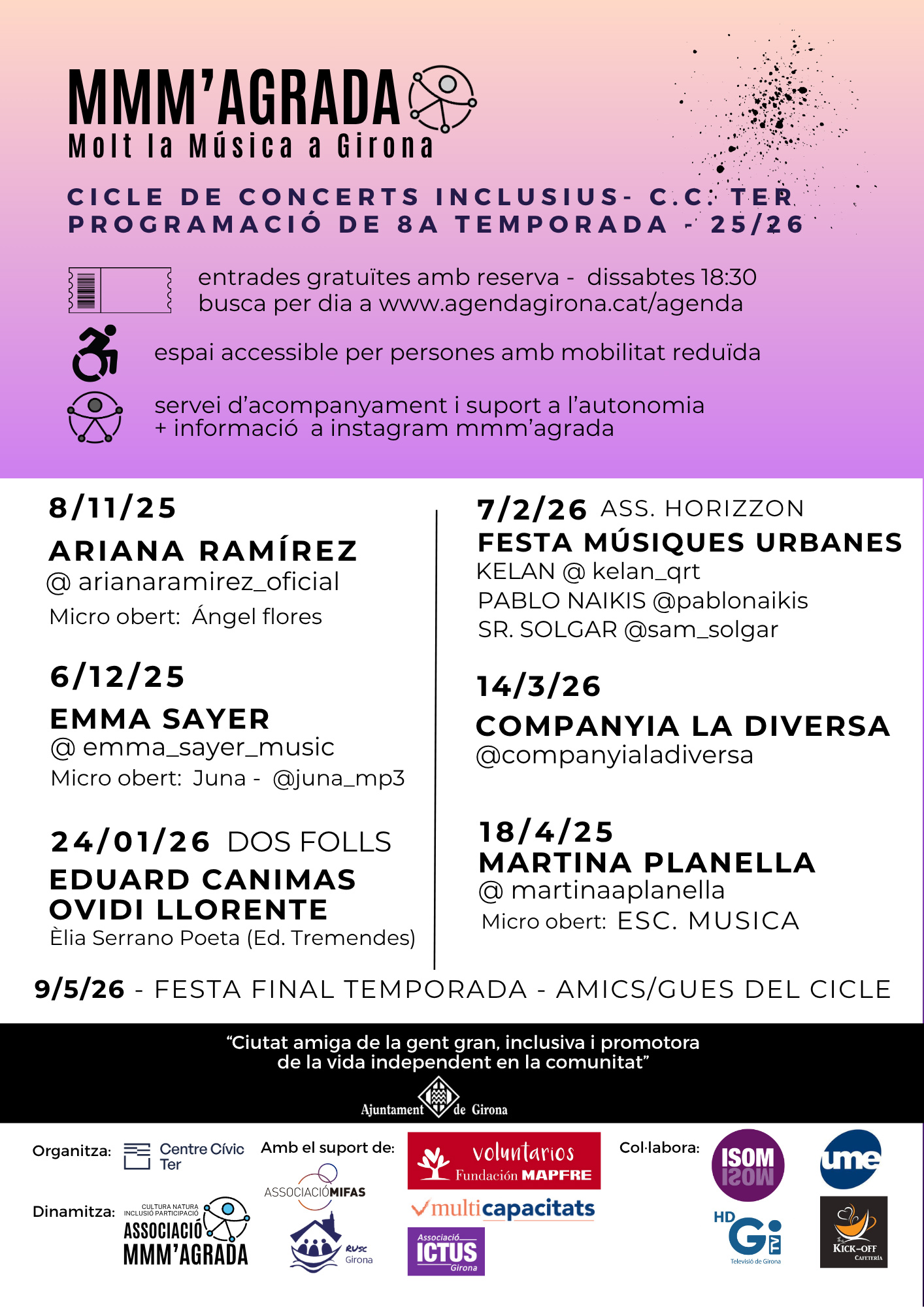 “Aquest cicle és un exemple més del projecte de dinamització comunitària que impulsem des del Centre Cívic Ter, en col·laboració amb les entitats i associacions del territori. ‘Mmm’agrada molt la música Girona’ posa la cultura a l’abast de tothom i reforça la nostra aposta per una ciutat inclusiva, diversa i viva, on totes les persones tinguin cabuda i es puguin sentir part de la vida cultural”, ha destacat la tinenta d’alcaldia i regidora de Servei a les Persones de l’Ajuntament de Girona, Núria Riquelme Zurita.