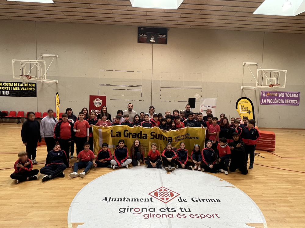 Més de 350 escolars participen en la 12a edició del programa “La Grada Suma. Amb valors sempre guanyem!”, iniciativa organitzada per l’Ajuntament de Girona i el Consell Esportiu del Gironès (CEG) i que compta amb la implicació de l’Spar Girona, el Bàsquet Girona i el Girona FC. Aquest matí, han presentat la proposta d’aquest curs, el regidor d’Esports i Joventut de l’Ajuntament de Girona, Àdam Bertran Martínez; el representant territorial de l’Esport a Girona, Narcís Casassa Font; i la presidenta del CEG, Maria Sánchez Canaleta, al costat de la CEO del Bàsquet Girona, Stefi Batlle, i el president del Girona FC, Delfí Geli i l’alumnat de l’escola Taialà de Girona.
