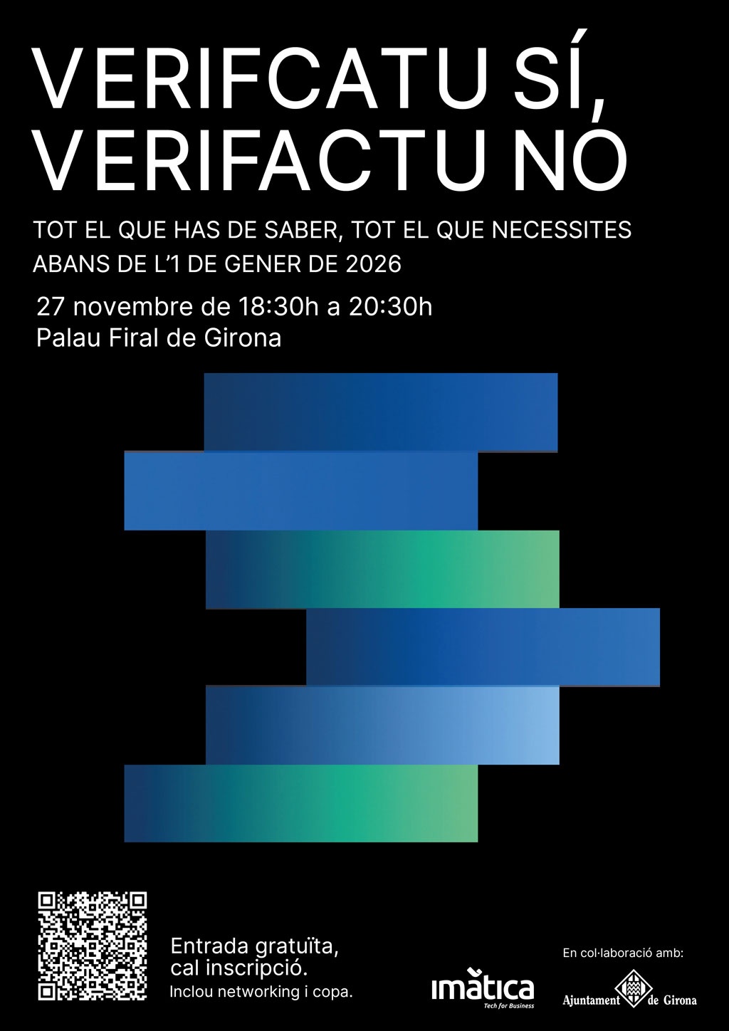 A partir del 2026, les PIMES i les persones autònomes estaran obligats a gestionar les seves factures a través del sistema de Verifactu. Per aquest motiu, l’Ajuntament de Girona col·labora amb l’empresa Imàtica en l’organització de la jornada “Verifactu sí, Verifactu no”, que tindrà lloc aquest dijous, dia 27 de novembre, de les 18.30 h a les 20.30 h al Palau de Fires de Girona.