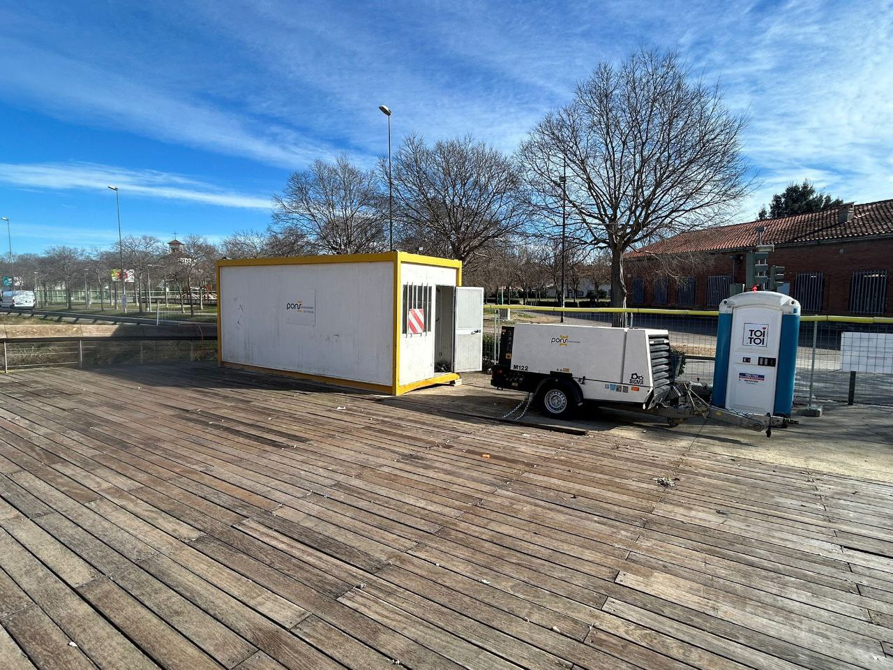 Aquestes obres, que tenen un termini d'execució previst de quatre mesos, consisteixen a retirar tots els taulons travessers de fusta per canviar-los, en cas que estiguin deteriorats, o bé per aplicar-los un tractament antilliscant, en cas que estiguin en bon estat. També s'està netejant i preparant tota l'estructura metàl·lica per eliminar restes d'impureses incrustades i de l'òxid i es faran tasques de conservació de l'estructura. Tot plegat, s'està fent amb la utilització d'una bastida metàl·lica amb proteccions inferiors i laterals per impedir que puguin caure restes de material al riu.