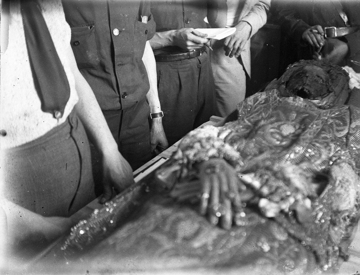 Poc temps després d'esclatar la revolució, la Comissió del Patrimoni Artístic i Arqueològic, de la qual Francesc Riuró (autor de la fotografia) n'era el secretari, es va presenciar l'obertura del sepulcre de Sant Narcís. En principi s'havia previst que es portessin les restes a una de les tombes de la mateixa església de Sant Feliu, però la Intervenció de la FAI (Federación Anarquista lbérica) va fer que s'exposessin a la sala municipal de la Rambla de la Llibertat. A la fotografia s'observa a diversos membres de la comissió envoltant les despulles.