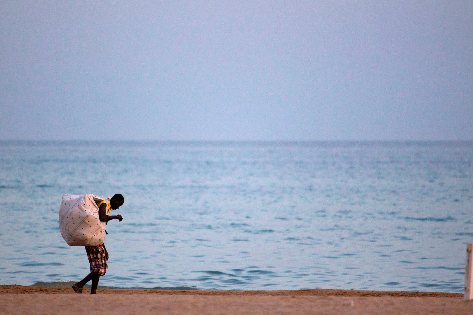 Catalunya ha estat tradicionalment terra d'acollida, amb diferents onades migratòries que al llarg del segle XX han deixat l'empremta tant a nivell social com econòmic i cultural. La majoria dels nouvinguts arriben a la recerca d'una vida millor que no sempre s'assoleix. Sovint són abocats a condicions d'inestabilitat i precarietat que deixen imatges d'una gran potència visual. És el cas d'aquesta imatge, en la qual es contraposa la solitud de la persona enmig de la immensitat del mar, sota el pes d'una manta, el contingut de la qual representa a la vegada la seva subsistència i la seva dependència de les màfies.