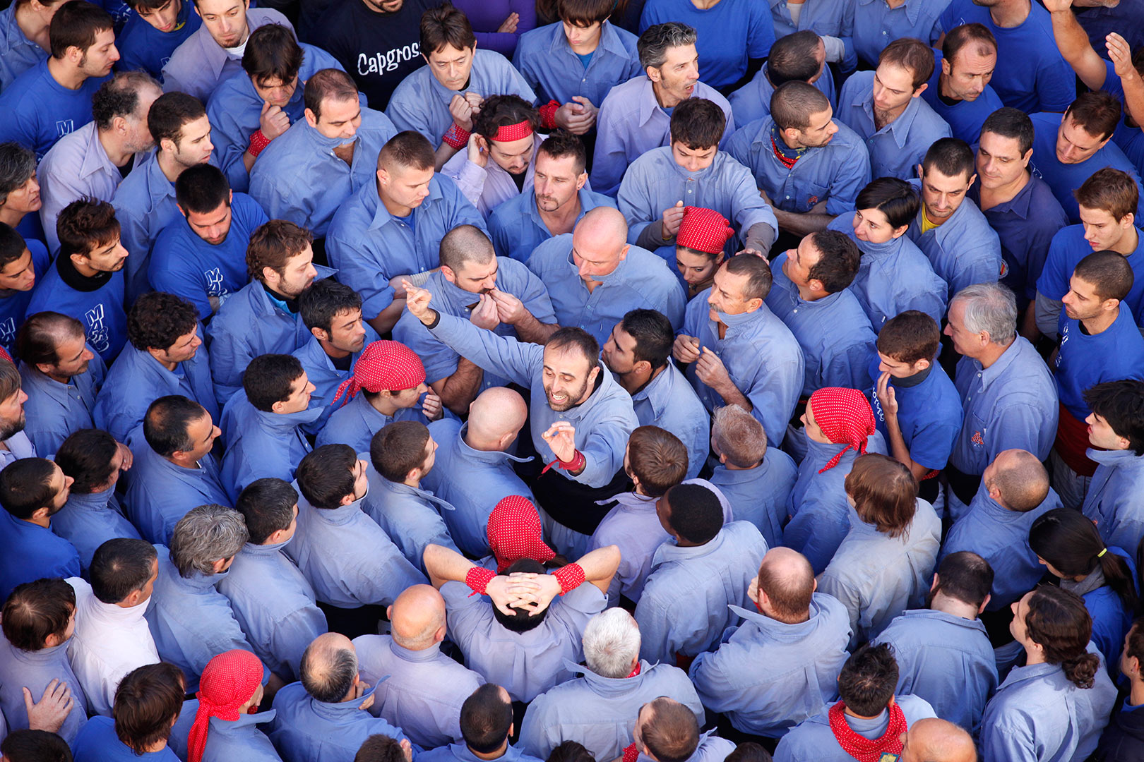 Abans d'aixecar un castell cal que els membres de la colla facin pinya per reforçar l'estructura humana que es vol alçar. L'èxit del castell dependrà de com s'interpreta de forma individual el rol assignat dins el grup. Es tracta d'una imatge d'una gran simplicitat on el joc amb el color i l'originalitat del punt de vista de la composició, a partir de l'element humà, reforcen el missatge que el fotògraf vol transmetre.